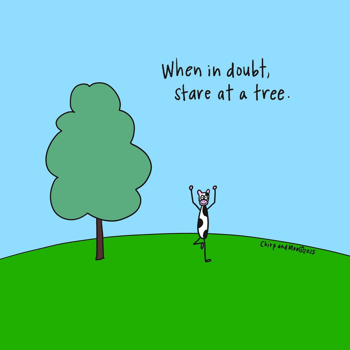 You could picture a tree like the one outside your window. And then, you could picture a cow doing yoga, standing in “tree” pose. Really, the choices are endless. Have fun with it.